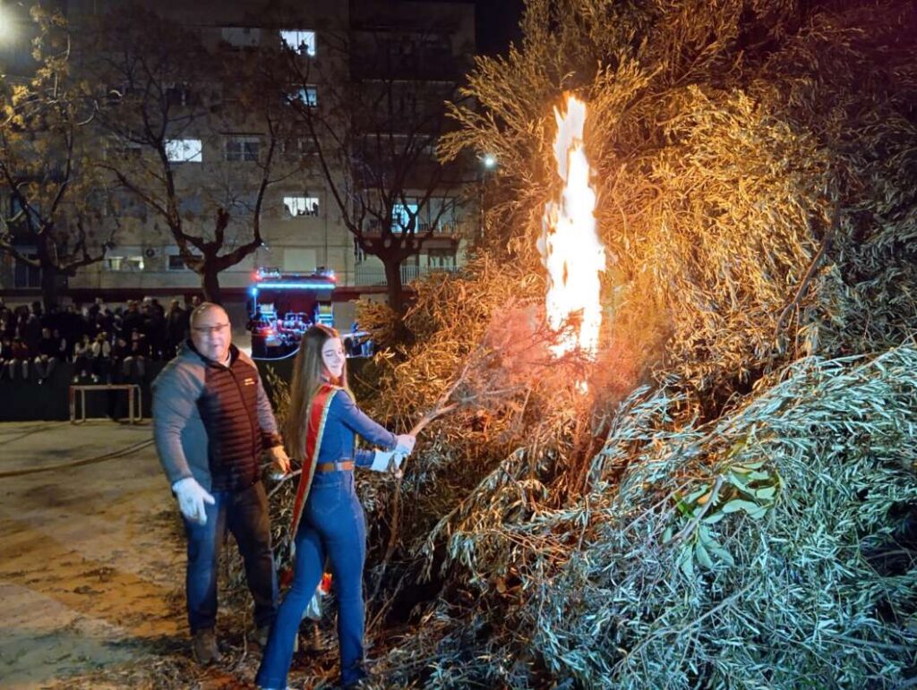 En la plaza Corts Valencianes a las ocho la dama de Caixa Vinaròs a prendido fuego a la hoguera de los mayorales y Caixa Vinaròs. Previamente, a las siete y media, ha actuado en la misma plaza el grupo folclórico Les Camaraes con bailes tradicionales de Vinaròs y comarca. Una vez el fuego ha devorado la hoguera se han repartido las tradicionales coquetes y moscatell.