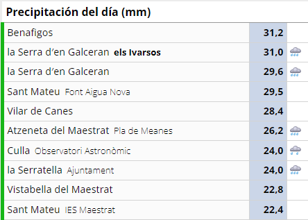 A nivel de lluvia, hasta las 19.00 horas aproximadamente de este lunes se han recogido 31,2 litros por metro cuadrado en Benafigos, 31 en La Serra d'en Garcerán; los 29,5 en Sant Mateu, los 26,2 en Atzaneta del Maestrat, o los 24 en Culla, tal y como recogen los datos de AVAMET.