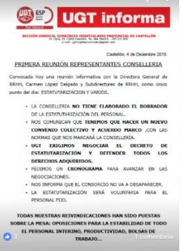 Desde UGT, se emitía un comunicado en el que se resalta que “La Conselleria no tiene elaborado el borrador de la estaturización del personal” o que la Conselleria les comunica que hay que redactar un nuevo Convenio Colectivo y acuerdo marco “con las normas que nos marque la Conselleria.