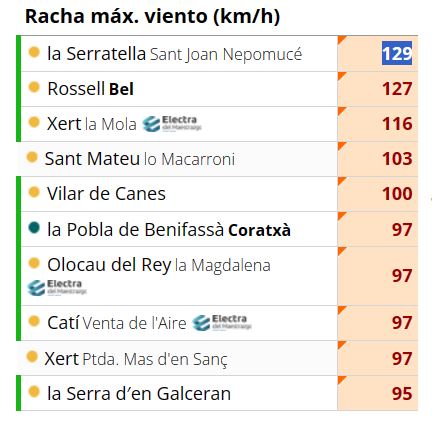 Este lunes, según informa la Asociación Valenciana de Meteorología (Avamet), municipios de Castelló han liderado las rachas de viento en la Comunitat Valenciana, con la Serratella en primer lugar, con 129 kilómetros, seguida de Rosell con 127, Xert con 116, y Sant Mateu con 103. Bomberos de Castelló, indica el 112, ha realizado diferentes intervenciones por caídas de árboles en el interior sur de Castelló. El domingo se registró en diferentes puntos de la provincia una importante tormenta.