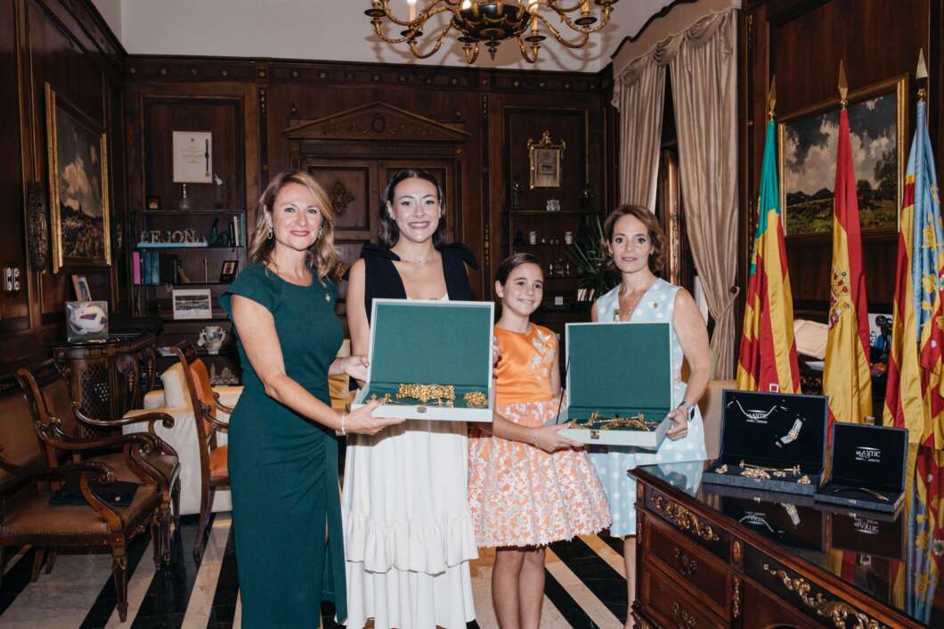 La alcaldesa de Castellón, Begoña Carrasco, acompañada de la concejala de Fiestas, Noelia Selma, ha hecho entrega de los aderezos oficiales que lucirán las máximas representantes de las fiestas de la ciudad, Paula Torres y Carla Ibáñez durante todo el ejercicio, a partir del acto de imposición de bandas que se celebrará el viernes y sábado respectivamente en el Teatro principal.