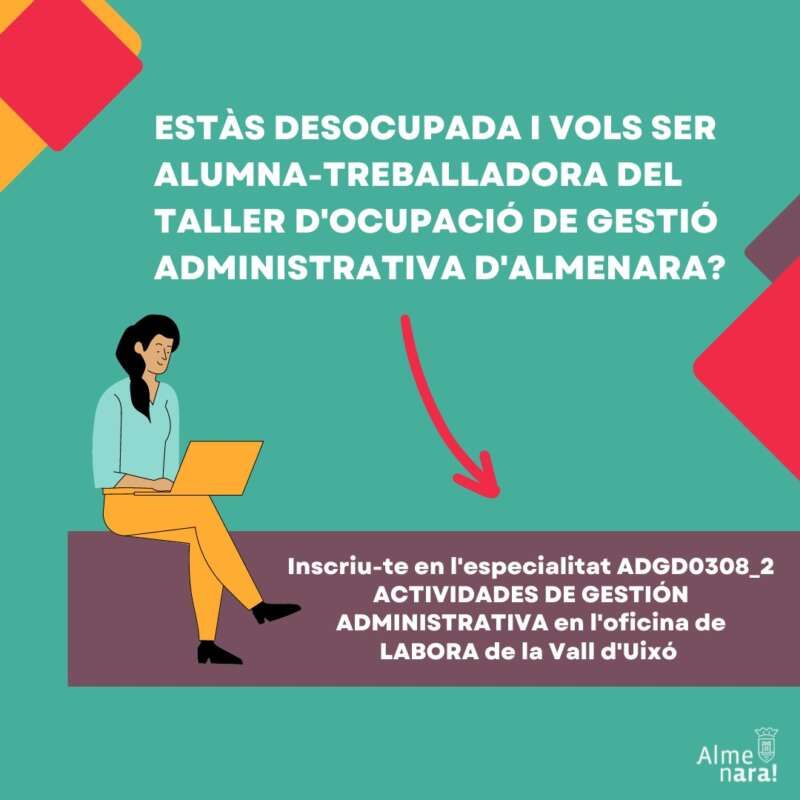 L'Ajuntament d'Almenara a poc a poc va fent els passos per a la posada en marxa al llarg del mes de novembre del Taller d'Ocupació per a Dones de la localitat que se centrarà en l'àrea de la gestió administrativa. En aquest cas informar que aquelles dones que estiguen interessades a participar en aquest projecte com a alumnes-treballadores, hauran de dirigir-se al centre Labora.