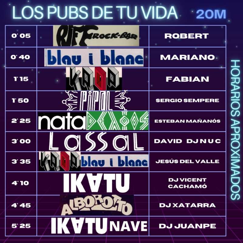 Els músics que participaran per ordre temporal aproximadament en l'acte són Robert, Mariano, Fabián, Sergio Sempere, Esteban Mañanós, David Dj Nuc, Jesús del Valle, Dj Vicent Cachamó, Dj Xatarra i Dj Juanpe. Tots ells van ser protagonistes durant aqueixes dècades en algun dels nou pubs esmentats i situats en la localitat d'Almassora.