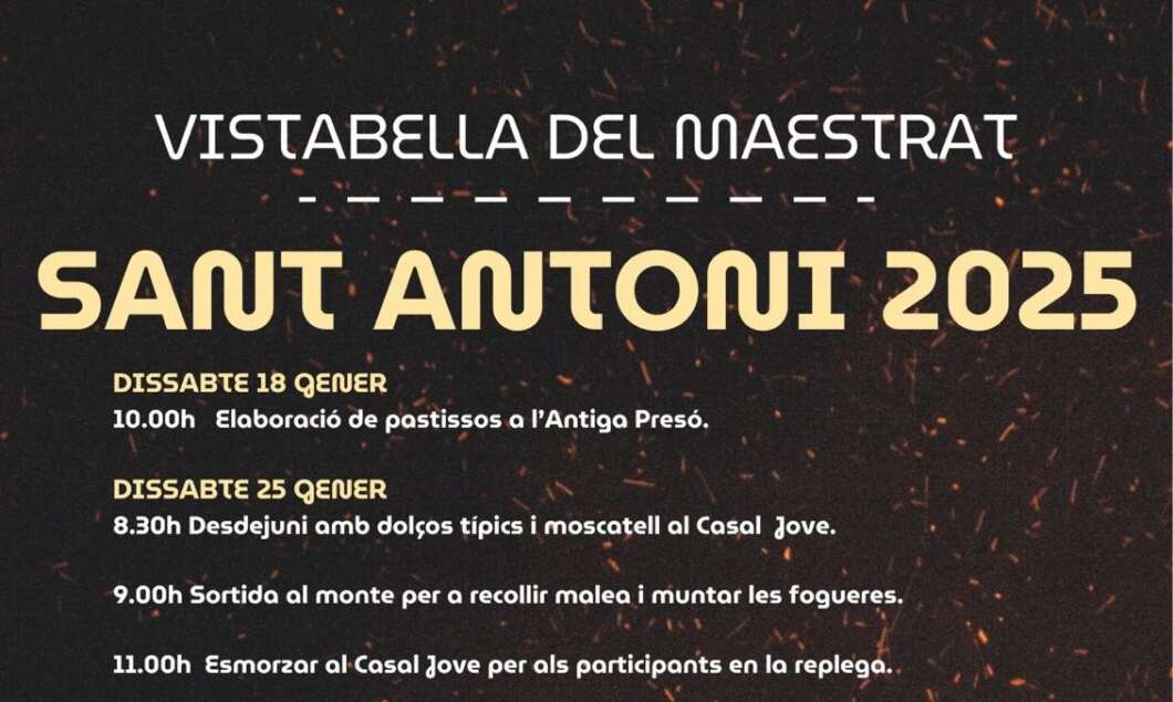 La festa arrancarà el 18 de gener amb l'elaboració dels tradicionals pastissets en l'antiga presó i, posteriorment, el 25 de gener, els veïns inauguraran la jornada amb un desdejuni format per dolços típics i acompanyat per moscatell, en el Casal Jove. A continuació, es realitzarà la tradicional eixida a la muntanya per a arreplegar malea per a les fogueres.