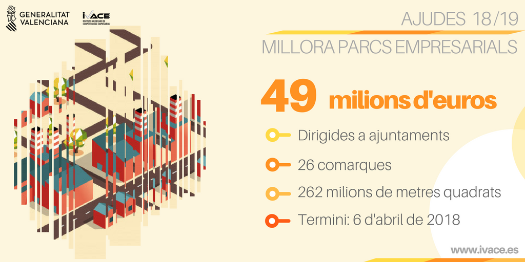 Les actuacions susceptibles d'ajuda per part de l'Ivace són l'obra civil que permeta la implantació de fibra òptica i altres serveis, vigilància a través de CCTV connectat a la Policia Local, carril bici, passarel·les de vianants, ampliació o creació de depuradora, millora de la imatge del polígon, millora de l'enllumenat públic, generació d'energia renovable i serveis contra incendis.