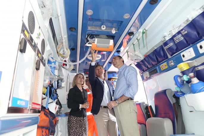 El conseller de Sanitat, Manuel Llombart, y el alcalde de Castellón, Alfonso Bataller, junto a la directora del servicio de Emergencias Sanitarias, Mercedes Carrasco, han visitado hoy la base del Servicio de Ayuda Médica Urgente (SAMU) situada en el Hospital la Magdalena.