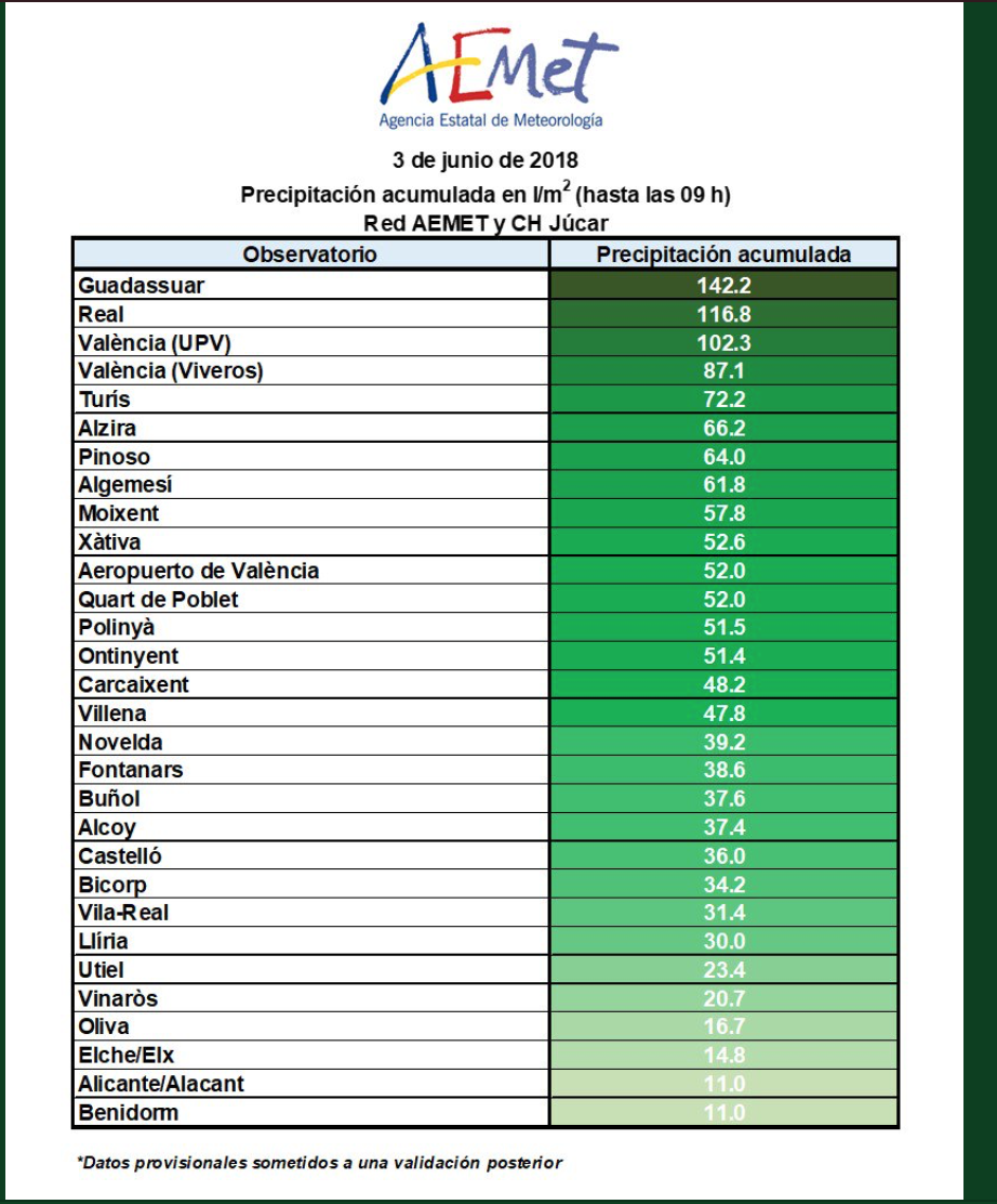 Las tormentas generalizadas que avanzaban de sur a norte de la Comunitat Valenciana han tenido mayor incidencia en la Ribera Alta, siendo los términos de Guadassuar y Real los más afectados, con 142,2 l/m2 y 116 l/m2 respectivamente. En algunas zonas de la ciudad de València se han alcanzado también los 100 l/m2, en la zona de la Avda de Tarongers, 102.3 l/m2 y en Viveros 87.1 l/m2.
