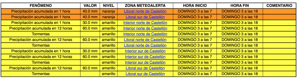 En el litoral de Castelló se mantiene el nivel naranja por lluvias. Se prevé todavía riesgo por lluvias nivel amarillo y riesgo por tormentas nivel amarillo a lo largo del día de hoy. La estación de PortCastelló ha superado los 10 l/m² en diez minutos con lluvia de intensidad alta. En Vila-real 31,4, aunque a estas horas la estación meteorológica local reporta 43 y a causa de fuertes lluvias y por razones de seguridad, la Policía Local ha procedido al corte de algunos caminos del término municipal. Se mantiene activada la Preemergencia en Castellón por riesgo importante de lluvias, hasta última hora de la tarde