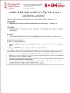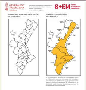 Anoche el Centro de Emergencias de la Generalitat Valenciana (CCE) modifico el nivel de la preemergencia de amarillo a naranja afectando a la totalidad de la provincia de Alicante y al interior sur de Valencia junto a la zona litoral de Valencia y Castelló.