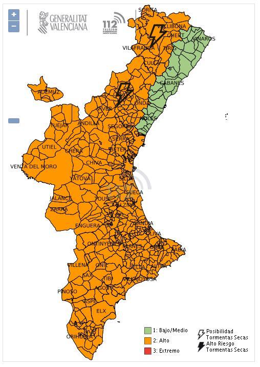 Generalitat. Para mañana la situación mejora y con ello la previsión de fuego, sin embargo, Valencia y Alicantes aumentan su nivel de preemergencia.