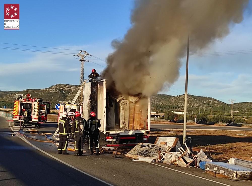El Consorcio Provincial de Bomberos trabaja esta mañana en el incendio de un camión que transportaba muebles en Peñíscola.