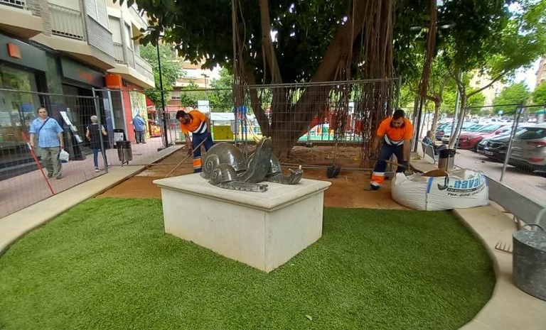 La escultura de Álvaro Falomir ha sido reinstalada sobre un pedestal en la zona verde debajo del árbol, fuera de la zona de juegos