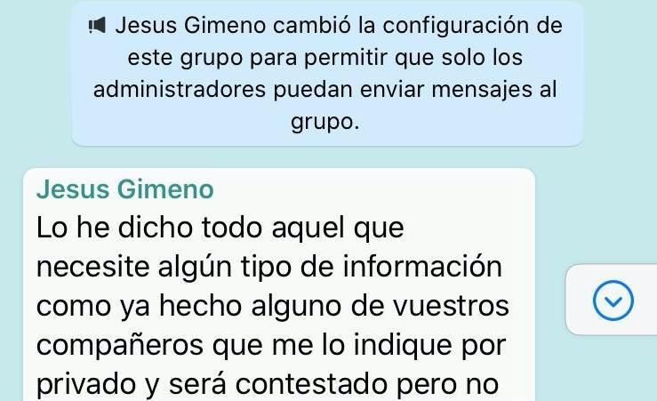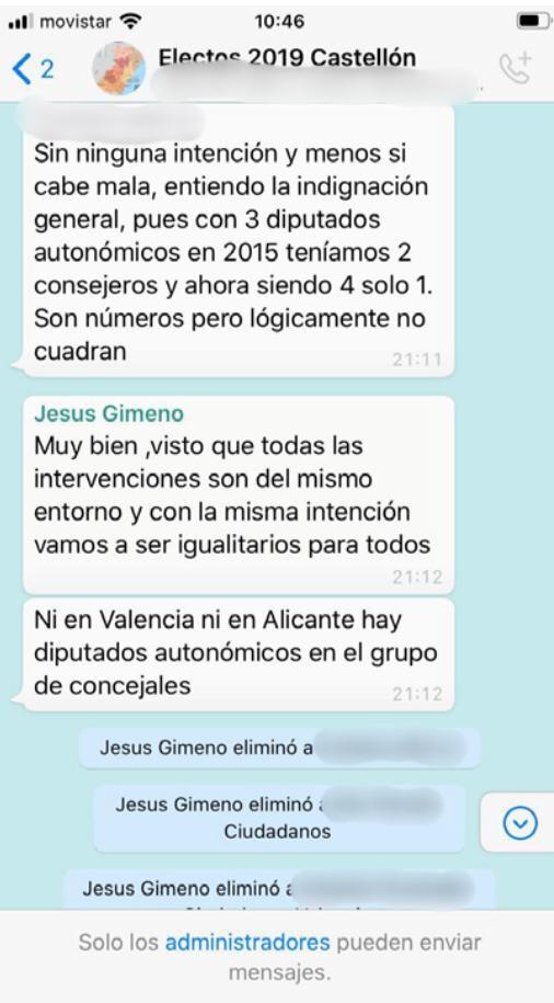 Y fue precisamente el pasado lunes, cuando en el Wassapp interno que mantienen los cargos electos de Ciudadanos, para poder comunicarse entre ellos, salió a relucir el tema. El administrador del Wassapp es el secretario institucional, Jesús Gimeno a quien las críticas recibidas no agradaron lo más mínimo.