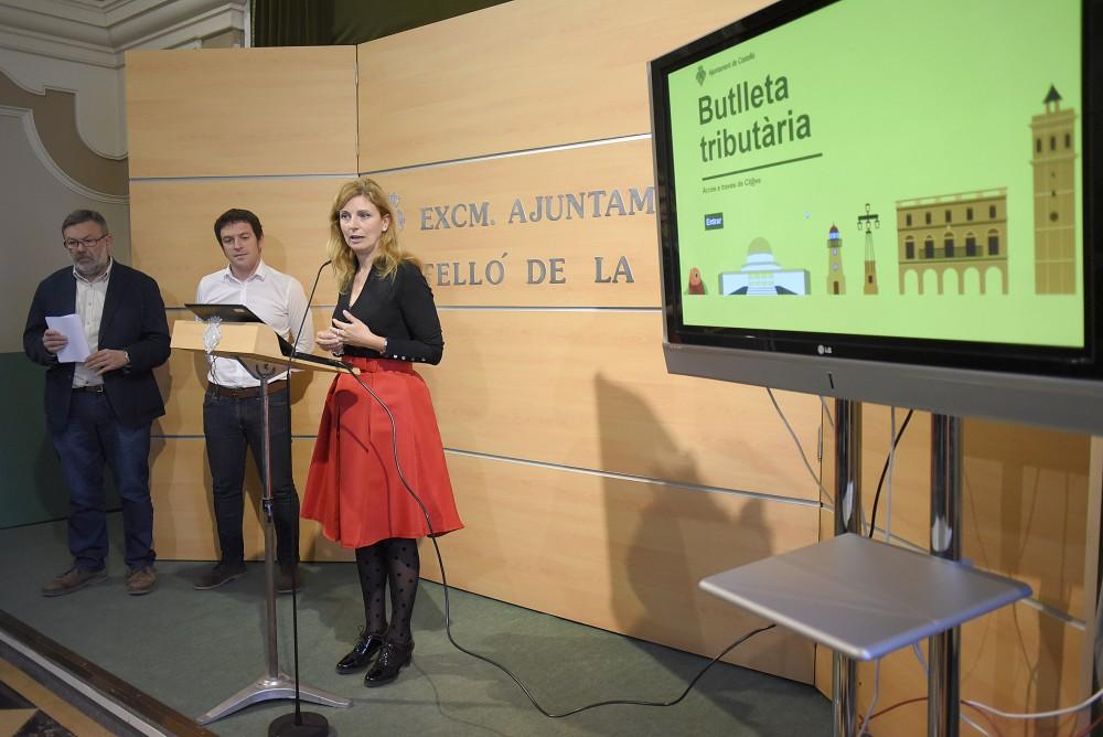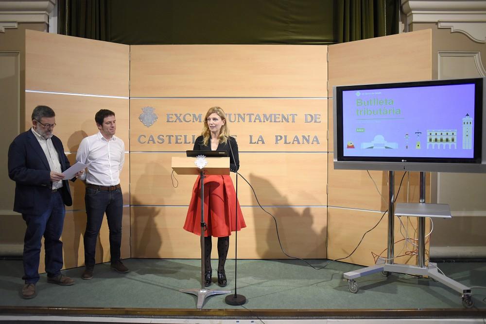 La alcaldesa de Castellón, Amparo Marco, el concejal de Hacienda, Toni Lorenzo y el concejal de Modernización, Ignasi Garcia, han presentado esta mañana el proyecto de la 'Butlleta Tributària', que se pondrá en marcha durante la primera quincena de abril.