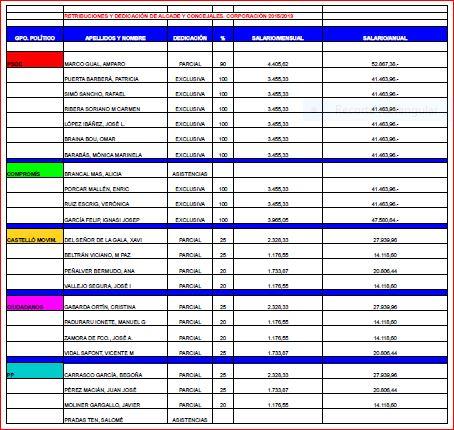 Por otra parte, también se introdujo un cambio en las valoraciones, en el 2015, cuando se modificó la base económica sobre la que se tenían que calcular estas dedicaciones. En lugar de tomar como referencia el sueldo de los funcionarios que más cobraban, lo hicieron tomando como referencia el sueldo de los menos pagados. El acuerdo del equipo de Gobierno de PSOE y Compromís estableció el cálculo de los sueldos multiplicando ese sueldo más bajo por 3,5. Pero cuando Castelló en Moviment dio su apoyo para lograr el Gobierno, condicionó el sueldo a la baja, de forma que se tomaba como referencia