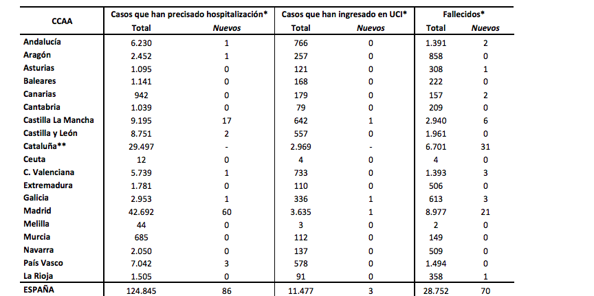 El número de fallecidos por coronavirus ha vuelto a repuntar en España en las últimas 24 horas. 70 personas han perdido la vida por las 48 notificadas en la jornada de ayer. España suma ya 28.752 muertes desde el inicio de la pandemia.