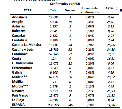La nota positiva este domingo la pone la del número de contagiados, que se reduce en 115 respecto a la notificación del sábado. Este domingo se han registrado 246 nuevas infecciones, pero hay que tener en cuenta el efecto fin de semana en la notificación. De esta forma ya se han producido en el país un total de 235.772 contagios.