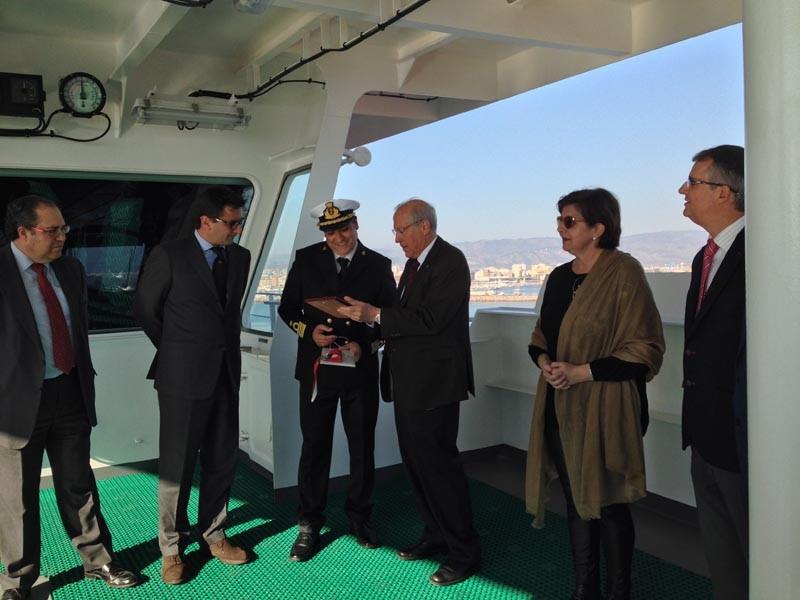 Durante la presentación, realizada esta mañana, el presidente de la Autoridad Portuaria de Castellón, Juan José Monzonís, acompañado por miembros de la empresa Línea Messina, y Gimeno Marítimo, han visitado la bodega y el puente de mando. El presidente de la Autoridad Portuaria, ha entregado una metopa al capitán del barco Francesco Scotto.