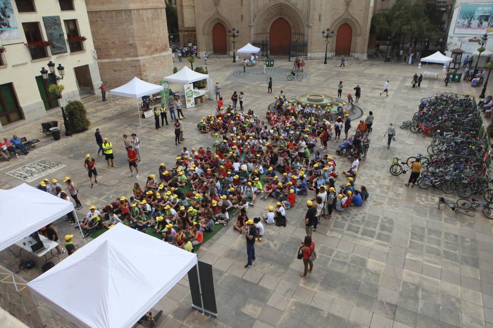 Decenas de bicicletas aparcadas frente al Mercado Central. También algún patinete. La plaza Mayor de Castellón ha acogido hoy a los más de 300 estudiantes de Primaria que han protagonizado la bicicletada escolar organizada por la Concejalía de Movilidad para sumarse al Día Sin Coches, dentro de la Semana Europea de la Movilidad. Alumnado de los colegios Carles Salvador, Censal, Gaetà Huguet, Illes Columbretes, Jaume I, Manel Garcia Grau i Vicent Artero se han dirigido desde sus escuelas al parque Ribalta, donde se ha fijado el punto de encuentro, y después han realizado un recorrido conjunto por la ciudad que ha finalizado en la plaza Mayor.