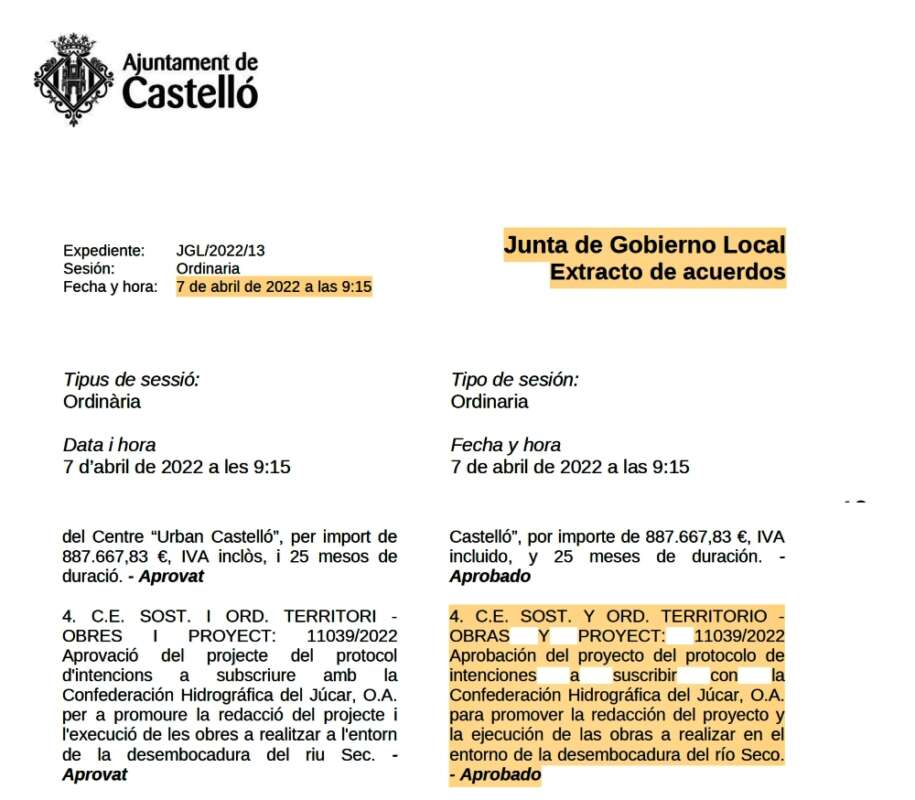 Es más, la firma de aquel protocolo de intenciones fue aprobado en Junta de Gobierno Local en fecha de 7 de abril de 2022. Figuraba en el Orden Ordinario de la JGL, número 4, con el siguiente texto: “Aprobación del proyecto de protocolo de intenciones a suscribir con la Confederación Hidrográfica del Júcar, OA, para promover la redacción del proyecto y la ejecución de las obras a realizar en el entorno de la desembocadura del Río Seco”.