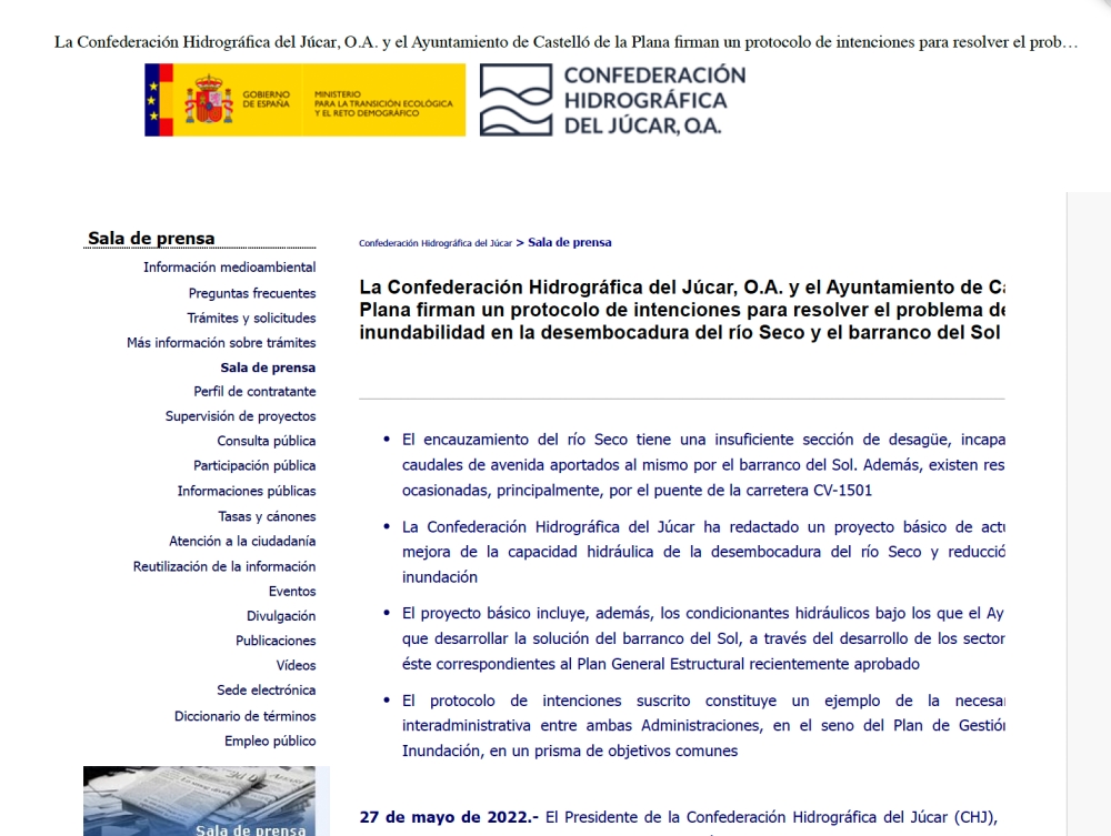 Castellón información publicaba una información el pasado día 17 de septiembre en el que se planteaba si existió o no un Protocolo de Intenciones firmado entre la Confederación Hidrográfica del Júcar y el Ayuntamiento de Castellón para solucionar la inundación del Barranco del Sol y ampliar el cauce del Río Seco en el puente de la desembocadura.