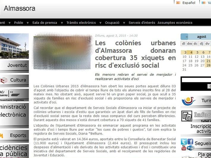 El Grupo Municipal del Partido Popular en Almassora ha rogado al bipartito que gobierna en la población "responsabilidad" para "dejar de señalar a los menores derivados de Servicios Sociales que utilizan servicios municipales, como el programa de Colònies Urbanes, con el único objetivo de lucirse en titulares". En opinión de la regidora del Partido Popular, María Tormo, "el servicio de Colònies Urbanes que planificamos durante el pasado mandato y presentamos el 13 de abril a la población es un servicio dirigido a todas las familias, repito, a todas las familias".
