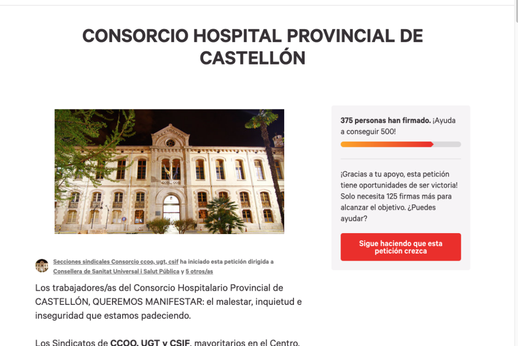 Los sindicatos con mayor representación en el hospital Provincial de Castellón han iniciado una recogida de firmas a través de la red social Change.org, para protestar contra la inseguridad y las condiciones en que se encuentran. Se quejan de la gestión del centro sanitario y dirigen su manifiesto a la Conselleria de Sanidad, pero también contra los representantes políticos de los distintos partidos políticos en Les Corts Valencianes