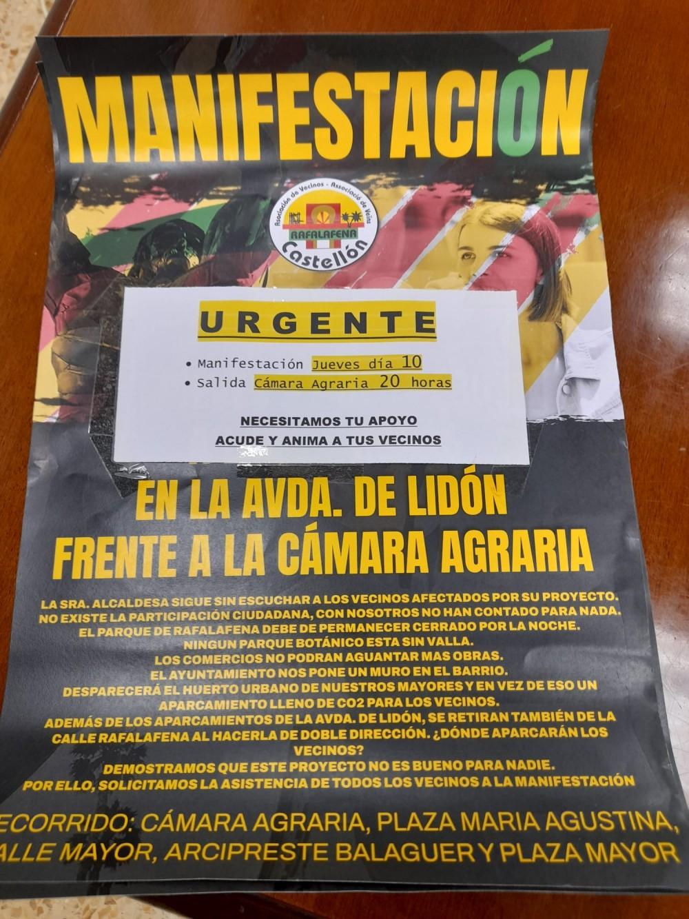 Los vecinos de la Asociación de Vecinos de Rafalafena han vuelto a convocar una manifestación en contra de la remodelación de la avenida de Lidón para el jueves, 10 de febrero, a las 20:00 horas.