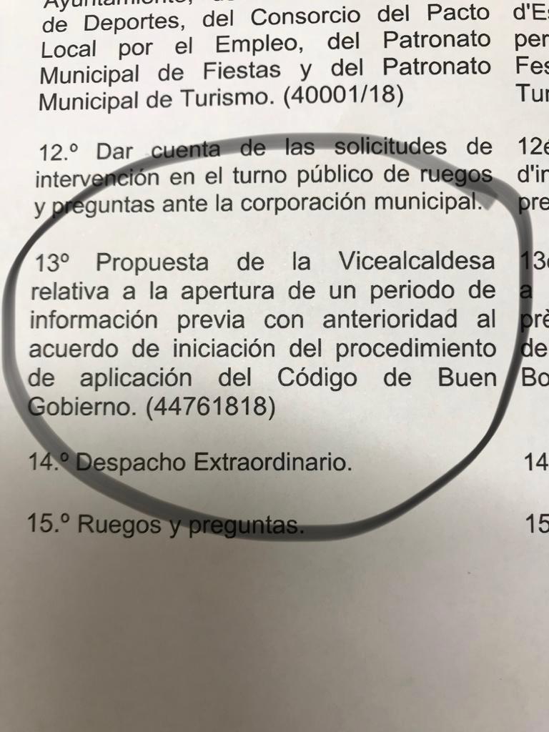 La Convocatoria oficial que los grupos políticos recibieron a última hora del mediodía del lunes incluía lo indicado en el Comunicado de Compromís, en el punto 13, con el siguiente enunciado: “Propuesta de la vicealcaldesa relativa a la apertura de un periodo de información previa con anterioridad al acuerdo de iniciación del procedimiento de aplicación del Código de Buen Gobierno”.