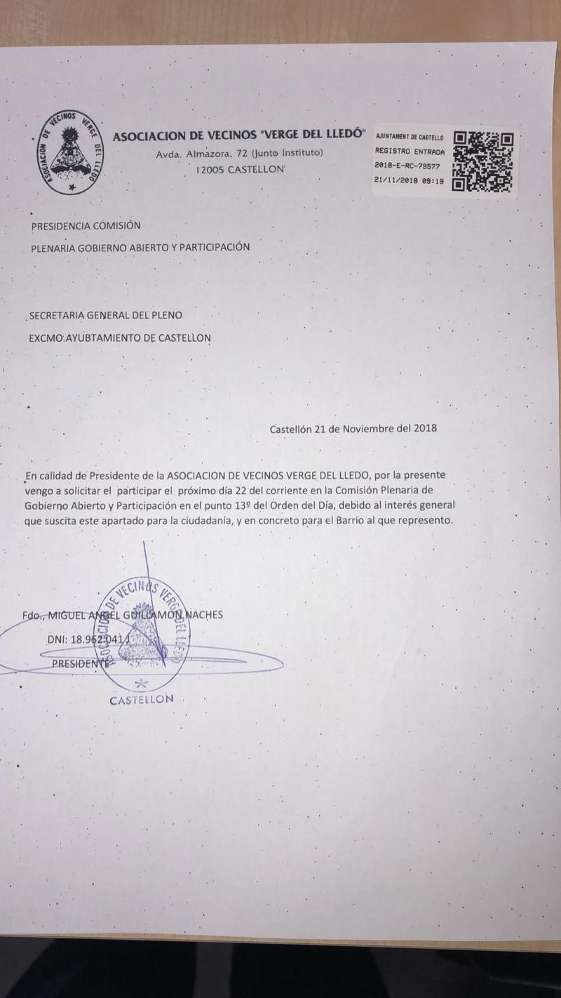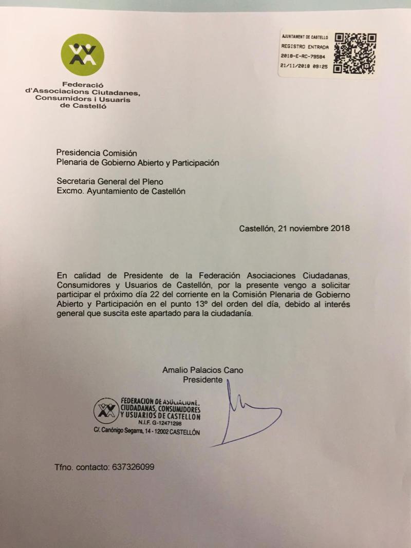 Por una parte, lo ha solicitado Miguel Angel Guillamón, en calidad de presidente de la Asociación de Vecinos Virgen de Lledó; y por otra, Amalio Palacios, como presidente de la Federación Asociaciones Ciudadanas Consumidores y Usuarios de Castellón.