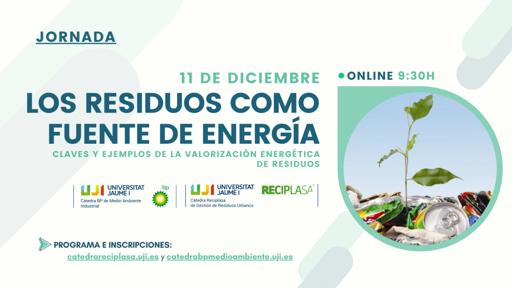 La Càtedra BP de Medi Ambient Industrial de l'UJI i la Càtedra Reciplasa de Gestió de Residus Urbans de l'UJI han organitzat conjuntament, per a divendres 11 de desembre de 2020, a les 9.30 hores, una jornada online sota el títol «Els residus com a font d'energia». Aquest esdeveniment, que se celebrarà a través de la plataforma Zoom, de manera gratuïta i mitjançant inscripció prèvia, exposarà algunes claus i exemples de la valorització energètica de residus.