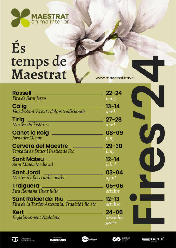 Maestrat, ànima interior, que engloba 10 municipios del Maestrat, ha presentado su calendario anual de ferias 2024, para que los visitantes y turistas puedan planificar su visita con suficiente antelación. Este calendario de ferias muestra del importante potencial turístico que tienen todos sus municipios, con una oferta experiencias turísticas basadas en sus recursos autóctonos, en su historia y tradiciones, ofreciendo al visitante el Maestrat más auténtico.