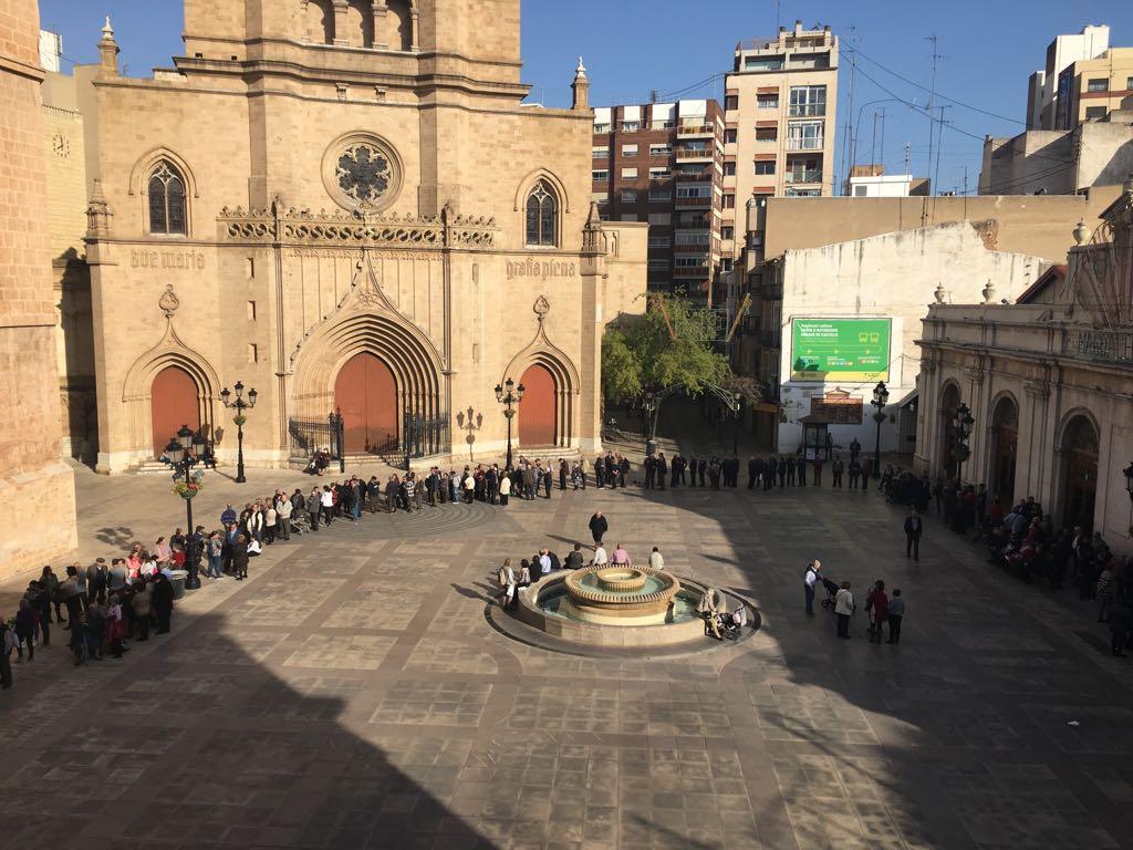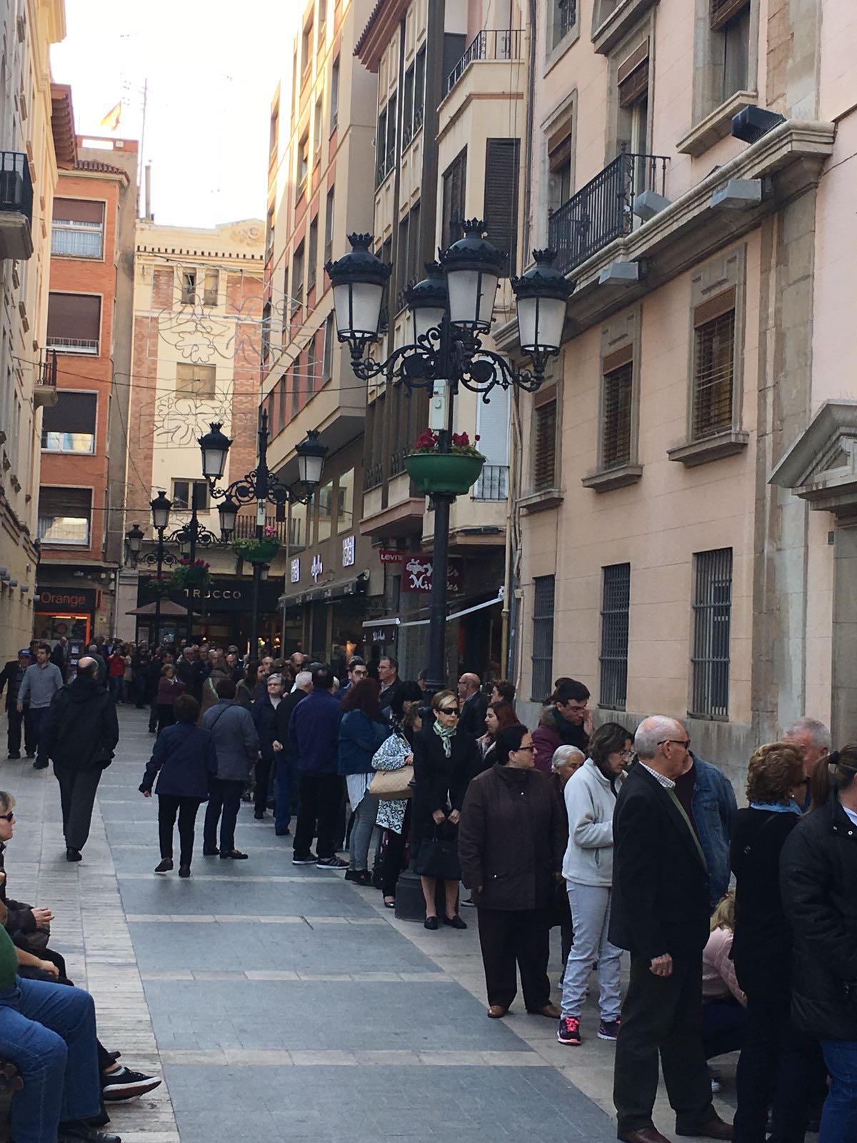 Esta tarde, la cola de gente daba la vuelta a toda la plaza Mayor e incluso salía por el pasaje José Ortega y llegaba a la calle En medio.