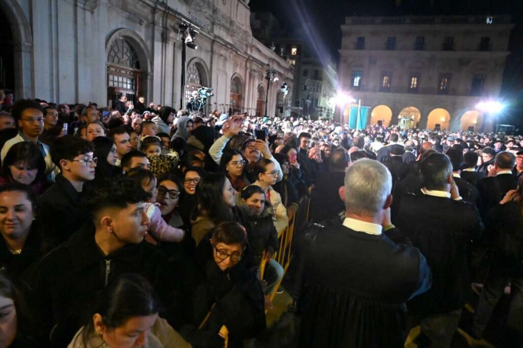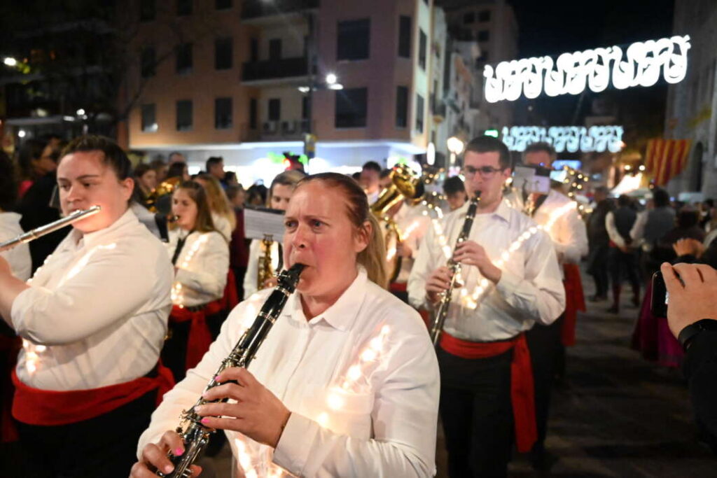 Otro de los momentos destacados fue la ofrena a la Mare de Déu del Lledó, evocada mediante una composición floral proyectada hasta formar la imagen de la patrona en la Concatedral. Durante esta escena actuó la Coral Sant Jaume, que interpretó en directo la ‘Salve Bressolera’, acompañada de piano.