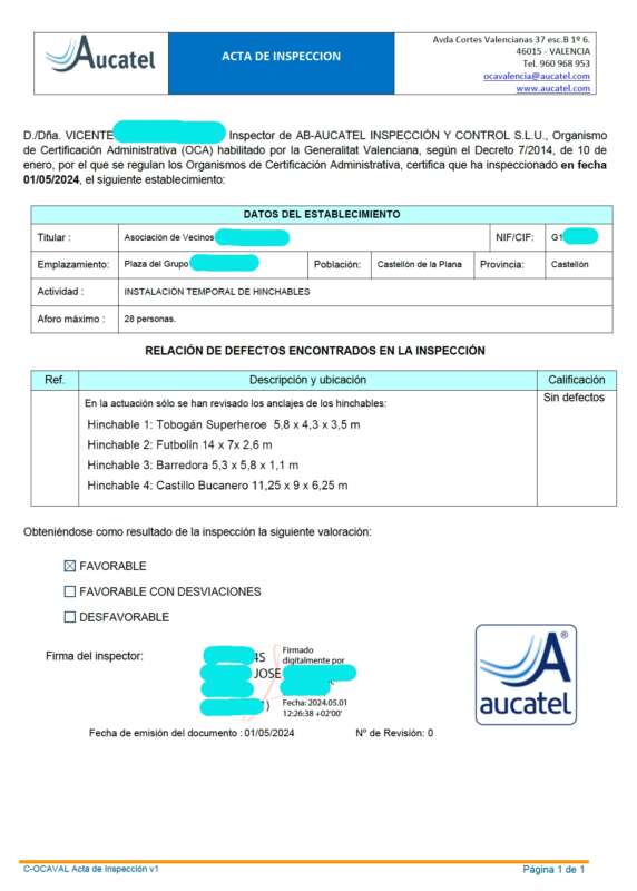 Los organizadores de las fiestas de los barrios de Castellón se quejaban a Castellón Información, porque cuando van a solicitar los permisos el Ayuntamiento, para poder poner castillos hinchables se les exige una OCA (Organismo Control Autorizado), esto es, un informe emitido por un técnico especializado, que certifique que la instalación y la actividad es completamente segura.
