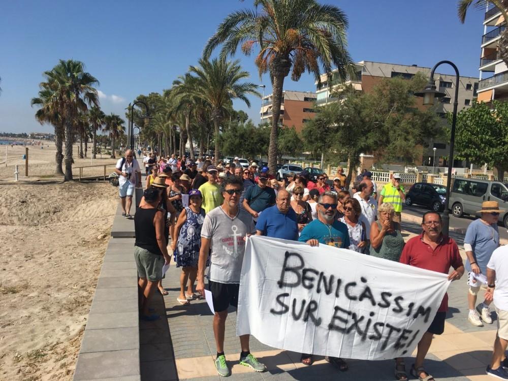 La Asociación de Vecinos de Benicàssim Sur se ha manifestado esta mañana para denunciar la discriminación que padece la zona sur de la localidad y exigir servicios y dotaciones para la misma. Bajo los lemas ‘Benicàssim Sur existe’ o ‘Queremos ser vecinos de primera y no de tercera’, la manifestación ha recorrido a partir de las 11,30 de la mañana el trayecto que va desde el límite del Camí la Ratlla hasta el Eurosol.
