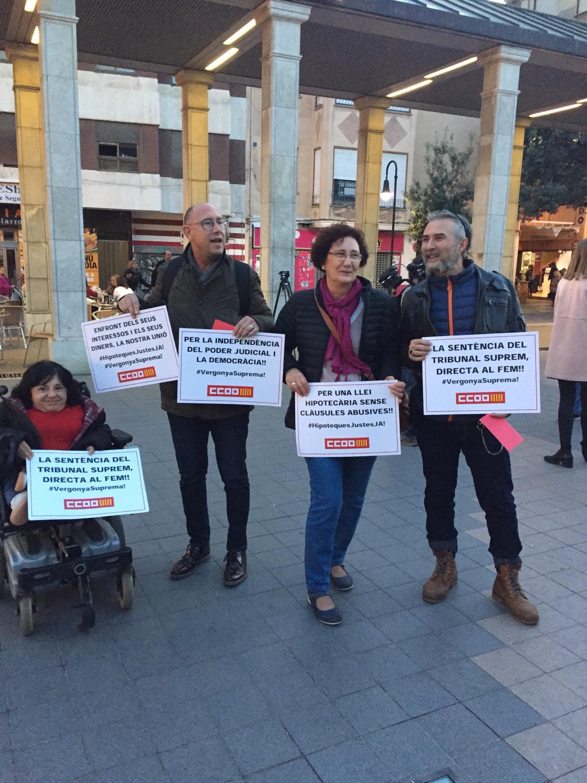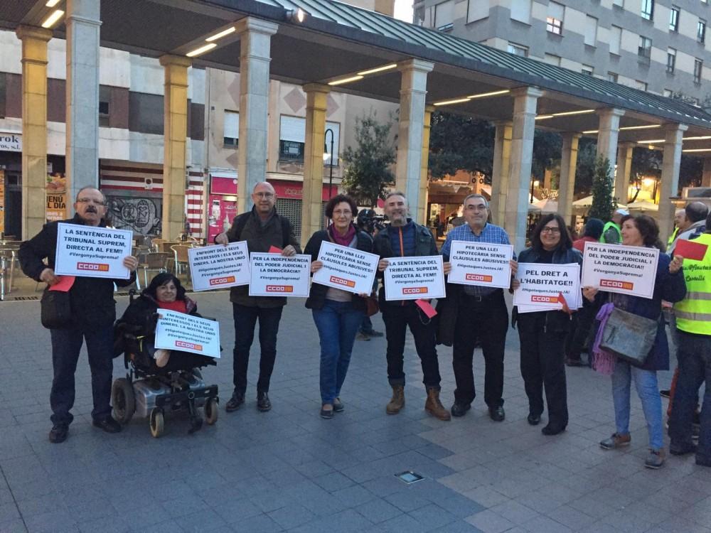 Medio centenar de personas se han manifestado esta tarde para protestar por la sentencia emitida por el Tribunal Supremo y que concierne al pago de los gastos de la tramitación de las hipotecas. La decisión del Supremo ha sido conflictiva porque, en una primera instancia se dictó sentencia por la cual se decidía que estos gastos fueran asumidos por las entidades bancarias. Pero inmediatamente después el Supremo dio marcha atrás y decidió convocar pleno de la entidad para tomar la decisión.