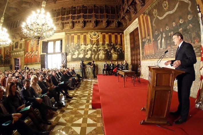 PALAU DE LA GENERALITAT. Salón de Cortes. ENCUENTRO DE ALCALDES Y ALCALDESAS POR UNA  FINANCIACIÓN JUSTA Molt Hble. President, Alcalde de Valencia, D. Joan Ribó, Alcalde de Alicante, D. Gabriel Echávarri, Alcaldesa de Castellón, D.ª Amparo Marco, Alcalde de Elx, D. Carlos González, Presidente de la Federación Valenciana de Municipios y Provincias; y Alcalde de Elda, D. Rubén Alfaro.Valencia 23 Abril 2016. (Photo: Alberto Sáiz)