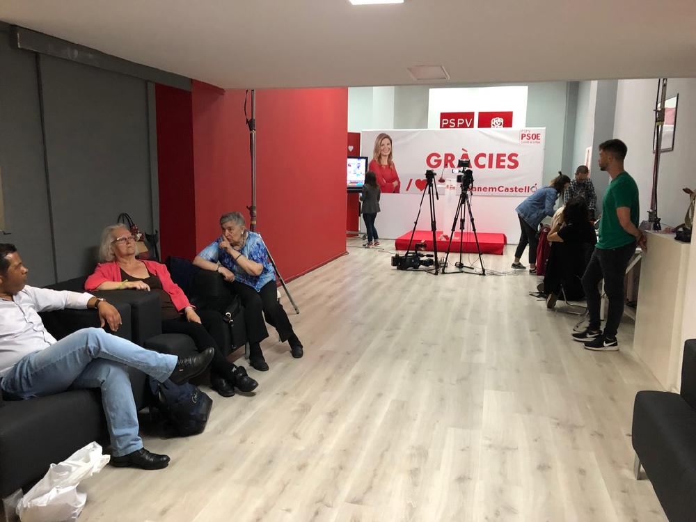 Los primeros resultados del escrutinio electoral fueron positivos desde el principio para el Partido Socialista, que se mantuvo toda la noche entre los 10 y los 11 concejales. Nervios si, pero la llegada de los apoderados con cara de felicidad confirmaba que también en estas elecciones el PSOE salía ganador. Con el 100% de los resultados, se confirmaban los 10 ediles y el liderazgo de Amparo Marco en la capital de la Plana.