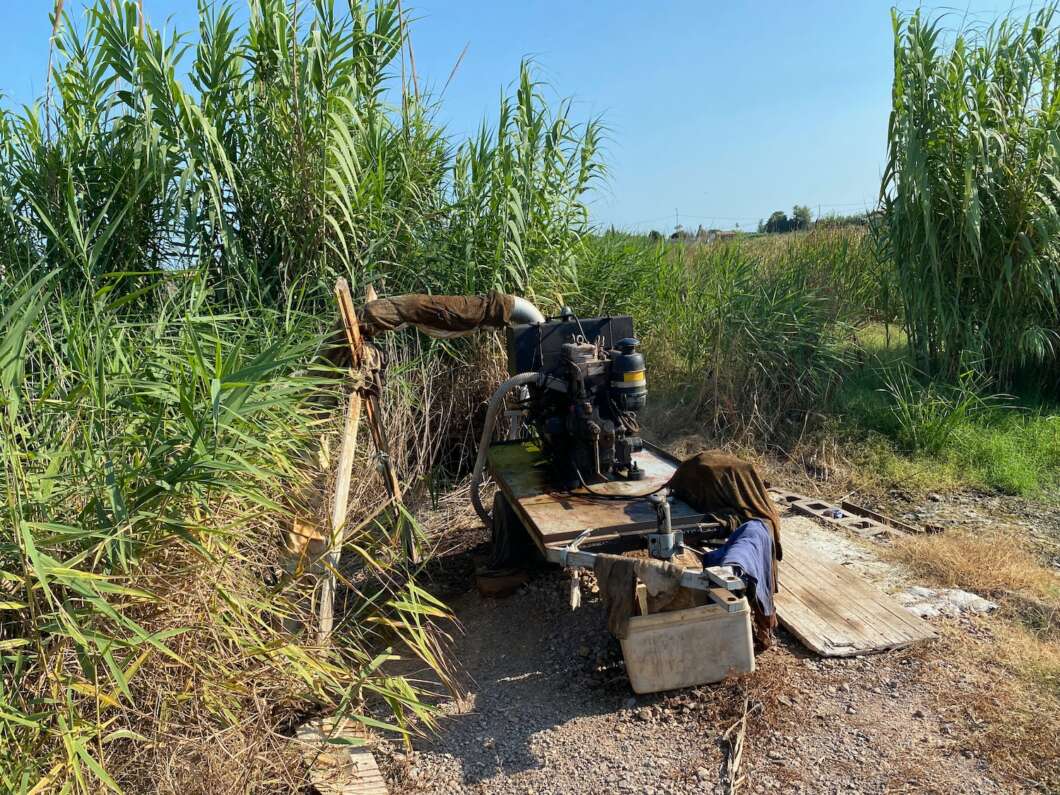 Junto al camino de la Carrerasa del Bovar hay un pequeño motor, que parece procedente de la segunda guerra mundial y que trabaja sin parar, noche y día, desde hace 3 años, para ‘ayudar’ a mantener el nivel freático de estas parcelas, y llevar el agua hasta la acequia de la Obra. Es un motor portátil del Coto Arrocero y apenas tiene capacidad para desarrollar su cometido. Pero, hoy por hoy, es el único que da algo de alivio a toda esa zona de la Molinera y del Bovar.