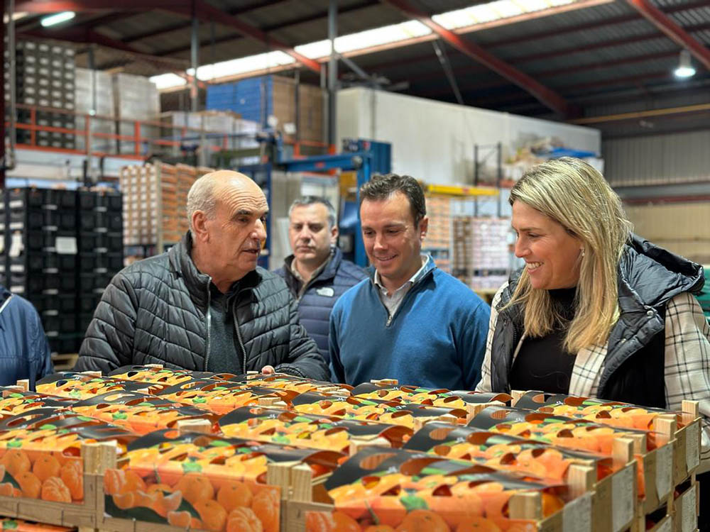 Junto con el candidato del PP a la alcaldía de Nules, José Adsuara, y el candidato de la Vall d’Uixó, Herminio Serra, visita cooperativas y comercios citrícolas y se reúne con agricultores