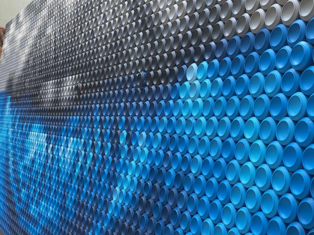'Sin título' es la instalación realizada con la técnica de pixelado, pintando sobre bases de latas de bebida recicladas, que nos remiten a una boca de mujer y al océano, un viaje de exploración a un recóndito paisaje que emerge en la integración de estos dos elementos. Para elaborar esta pieza, de 190 x 535 cm, se han reutilizado 3.000 latas, las mismas que se consumen en España cada 10 segundos.
