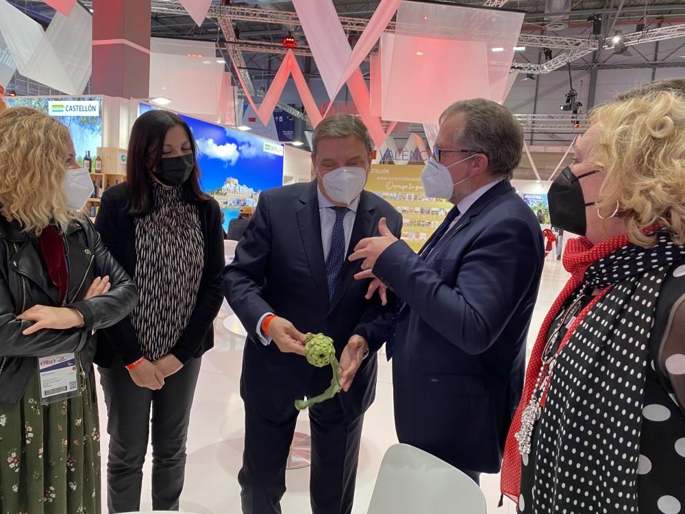 El presidente de la Diputación de Castellón, José Martí, ha destacado la calidad del sector agroalimentario de la provincia ante el ministro de Agricultura, Pesca y Alimentación, Luis Planas, que se ha acercado un año más al estand del Patronato Provincial de Turismo en la feria Fitur de Madrid para conocer de primera mano la oferta turística de cara a este 2022.