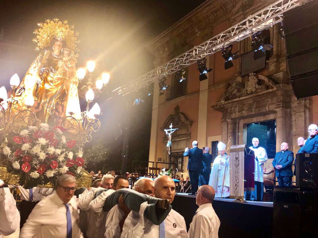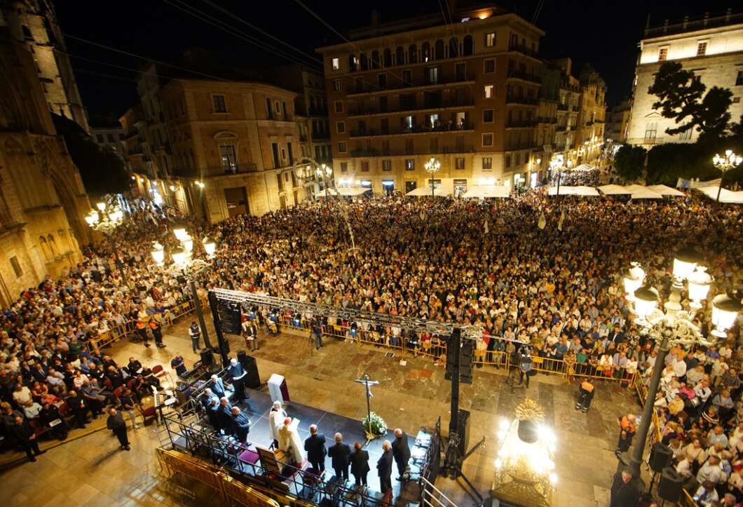 El público asistente se mantuvo de pie durante el desarrollo del acto, que comenzó a las 20:30 horas y terminó cerca de las 22 horas, con total devoción a la Virgen de los Desamparados, cuya imagen peregrina presidió la celebración.