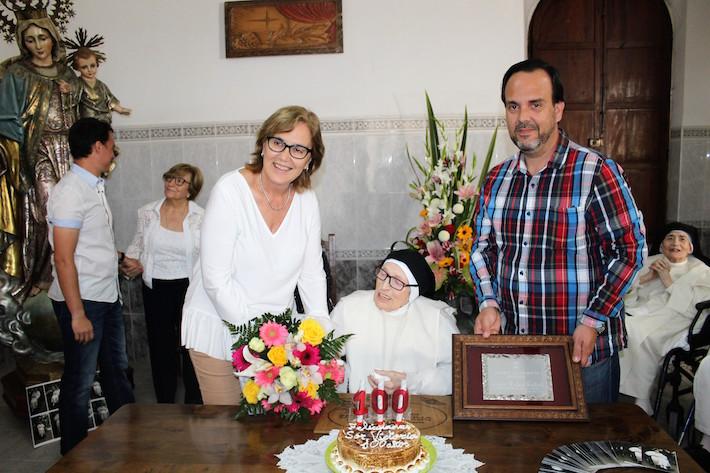 Tal com mana la tradició a Borriana, l'alcaldessa va fer lliurament d'un ram de flors a Sor M.ª Victoria, mentre Navarro lliurava la placa com a obsequi commemoratiu de l'aniversari. Tal com explicaven a través de la estampeta impresa per a l'ocasió, M.ª Victoria naixia un 24 de maig de 1917 i va començar amb la seua professió el dia 10 de juliol de 1943, amb el que ja compta amb 74 anys de dedicació. Després de les fotografies protocol·làries amb els representants municipals, familiars, amics i germanes, tots i totes van poder gaudir de l'aperitiu preparat per les Dominiques que en tot moment van mostrar una gran alegria per rebre a l'alcaldessa i regidors i per poder celebrar el centenari de M.ª Victoria.