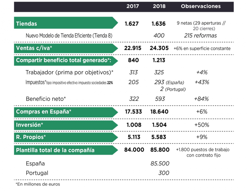La prueba iniciada en mayo de 2018 con la “Colmena” (almacén para online), en 97 municipios de la provincia de València, ha permitido duplicar el número de clientes y alcanzar una facturación mensual de 2,2 millones de euros. mantiene su principio de que "el crecimiento compartido sabe mejor" y ha distribuido el beneficio total generado en el ejercicio en diversas partidas. De los 593 millones del beneficio neto, 470 millones se han reinvertido en la empresa como recursos propios, mientras el resto se ha repartido entre los accionistas vía dividendos