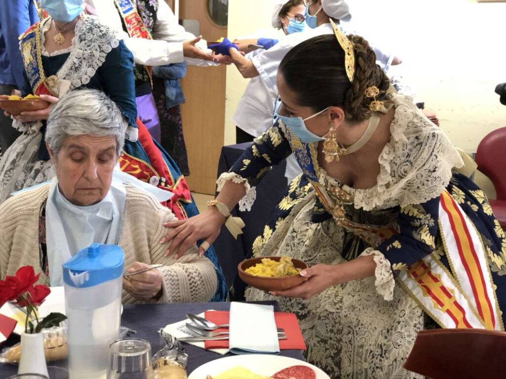 Al final de la missa l'activitat s'ha traslladat fins al carrer Sant Pere, on ha tingut lloc la ‘mascletà’ que dona pas a la visita a la Residència de la Tercera Edat per al repartiment d'arròs entre els més majors. La reina, al costat de les dames i cavallers, han compartit uns minuts amb les persones internes i la plantilla de professionals que els cuiden. I, a continuació, la comitiva ha tornat a la plaça d'Espanya a temps per a la benedicció de l'arròs i el repartiment entre les milers de persones que han fet cua durant el matí.
