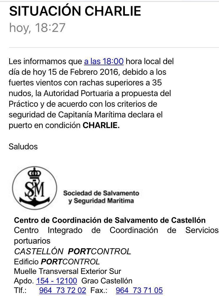 A las seis de esta tarde, Salvamento Marítimo remitía un comunicado, en el que señalaba que la Autoridad Portuaria de Castellón, a propuesta del práctico y con los criterios de Seguridad de Capitanía Marítima, declaraba la ‘situación Charlie’