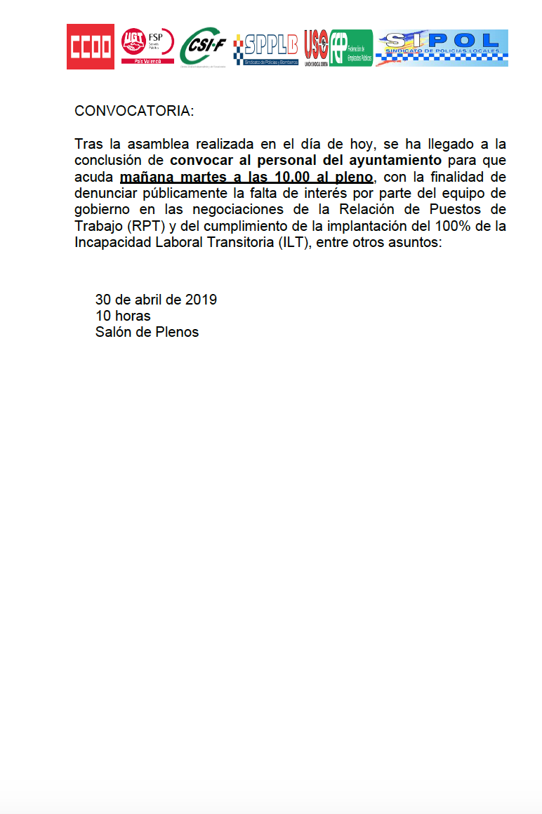 aquest punt és necessari el sentit comú i han d’entendre que arribem a on podem. La legislació d’estabilitat pressupostària, el control de les taxes de reposició i la normativa estatal no permetia avançar. Ara amb el nou panorama polític estem segurs que el bloqueig va a acabar. Per altra banda, vull que reflexionen, creuen que el que han fet hui soluciona alguna cosa? En octubre es va posar en marxa el procés però no hem aprovat per l’advertència de l’interventor que seria il·legal. Fa cinc mesos que la proposta està damunt la taula damunt la taula de la Intervenció municipal que haurà d’explicar perquè s’ha retardat tant el règim contributiu en situació de ILT. Per altra banda, som conscients que no tindre RLT genera molts problemes però han d’entendre que hem hagut de prioritzar despeses i ingressos”. Agents de la Policia Local present han recriminat a Benlloch que no s’haja complit la promesa. Han prioritzat unes davant altres, no creem que siga necessari qüestionar les nostres reivindicacions i no creem que el demanen genere un desajust tan gran”. L’alcalde ha respost que el que prioritza un equip de govern respecte a un altre “és una decisió política. No podíem aprovar una RLT a un mes de les municipals, no té sentit, el govern pot canviar. I no només defensem als treballadors públics, sinó també a tota la ciutat”, ha sentenciat.