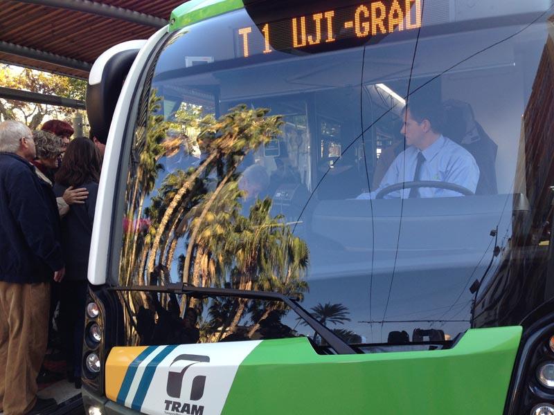 Miles de personas han utilizado el Tram hoy durante su puesta en servicio entre la UJI y el Grao. Largas colas de más de 50 personas y toda una fiesta en la ciudad. El presidente de la Generalitat, Alberto Fabra; y el alcalde de Castellón, Alfonso Bataller, se felicitaban por la inauguración del Tram, que con otras infraestructuras como el AVE o el Aeropuerto va a servir de punto de inflexión para sembrar el futuro de Castellón. Alberto Fabra destaca que el sistema del Tram es pionero en España y solo Roma y Londres disponen de sistemas similares.